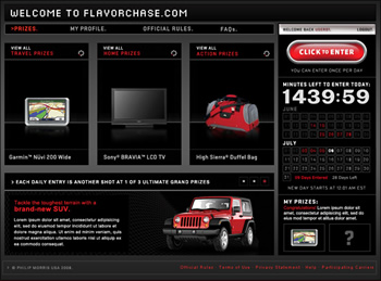 Description: With over 800,000 registrants and 335,000 daily entries during the two month life of the FlavorChase Sweepstakes, it became one of Phillip Morris’ most successful sweepstakes ever. Users entered daily for a chance to win one of thirty different prizes.
