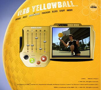 Part of a larger viral marketing campaign sponsored by the CDC, Verb Yellowball, the Verb Video Mixer allowed users to compose videos and share them. Each video segment features kids playing with and sharing the yellow balls. The video segments were shot such that the yellow ball entered and left the video frame in roughly the same location which allowed the segments to be combined in any order. This user-generated composition could then be set to music.